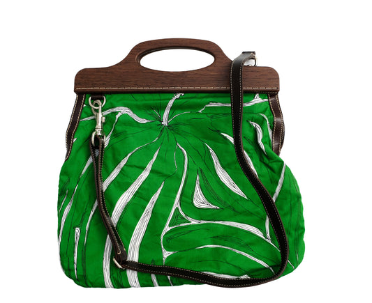 Miu Miu Tropical Leaf Print Cotton Handbag with Wooden Handles
