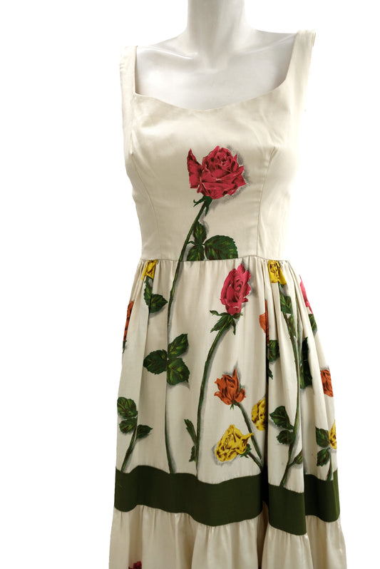 Frank Usher Vintage Sleeveless Tiered Maxi Dress in Rose Print, UK8-10