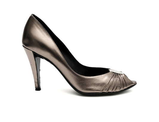 Salvatore Ferragamo Peep Toe Shoes in Silver Leather, UK5.5