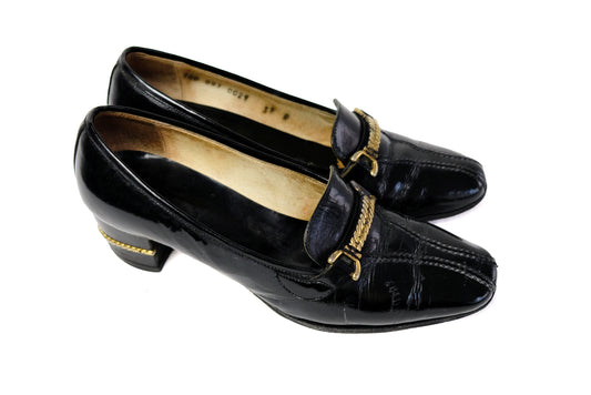 Gucci 1960s Vintage Shoes in Black Patent Leather with Gilt Chain Details, EU39