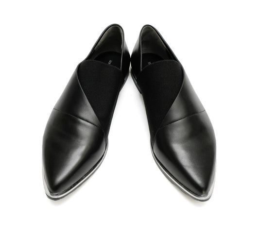 Issey Miyake Pointed Toe Flat Loafers in Black Leather with Silver Detail, EU39