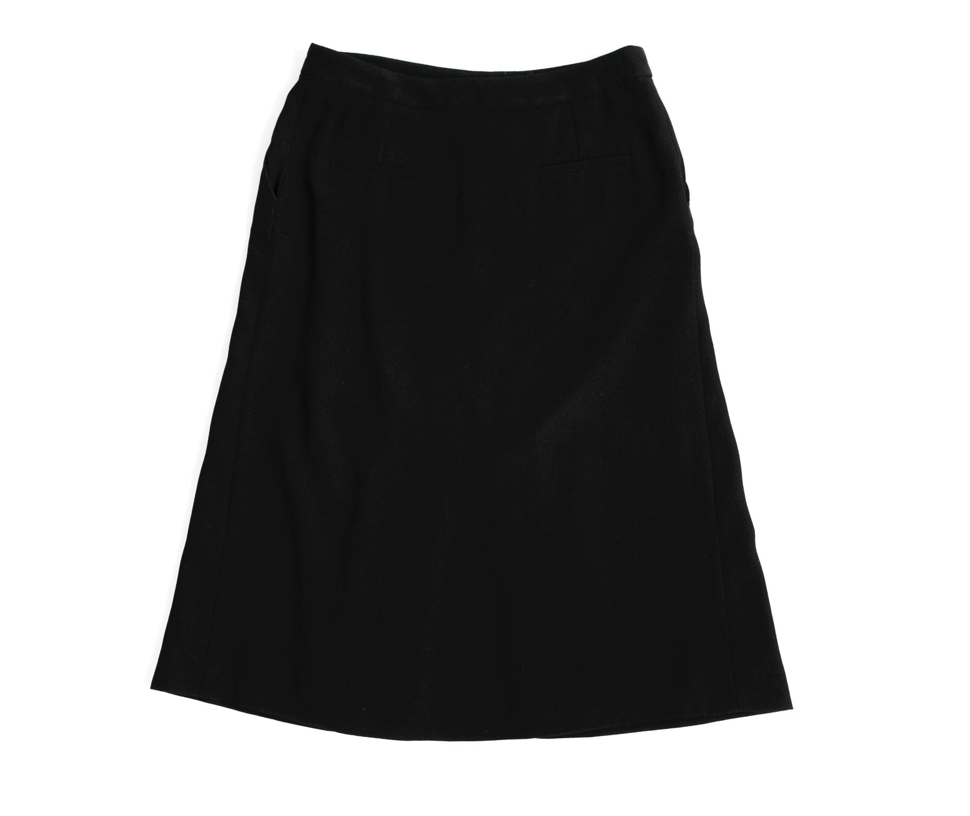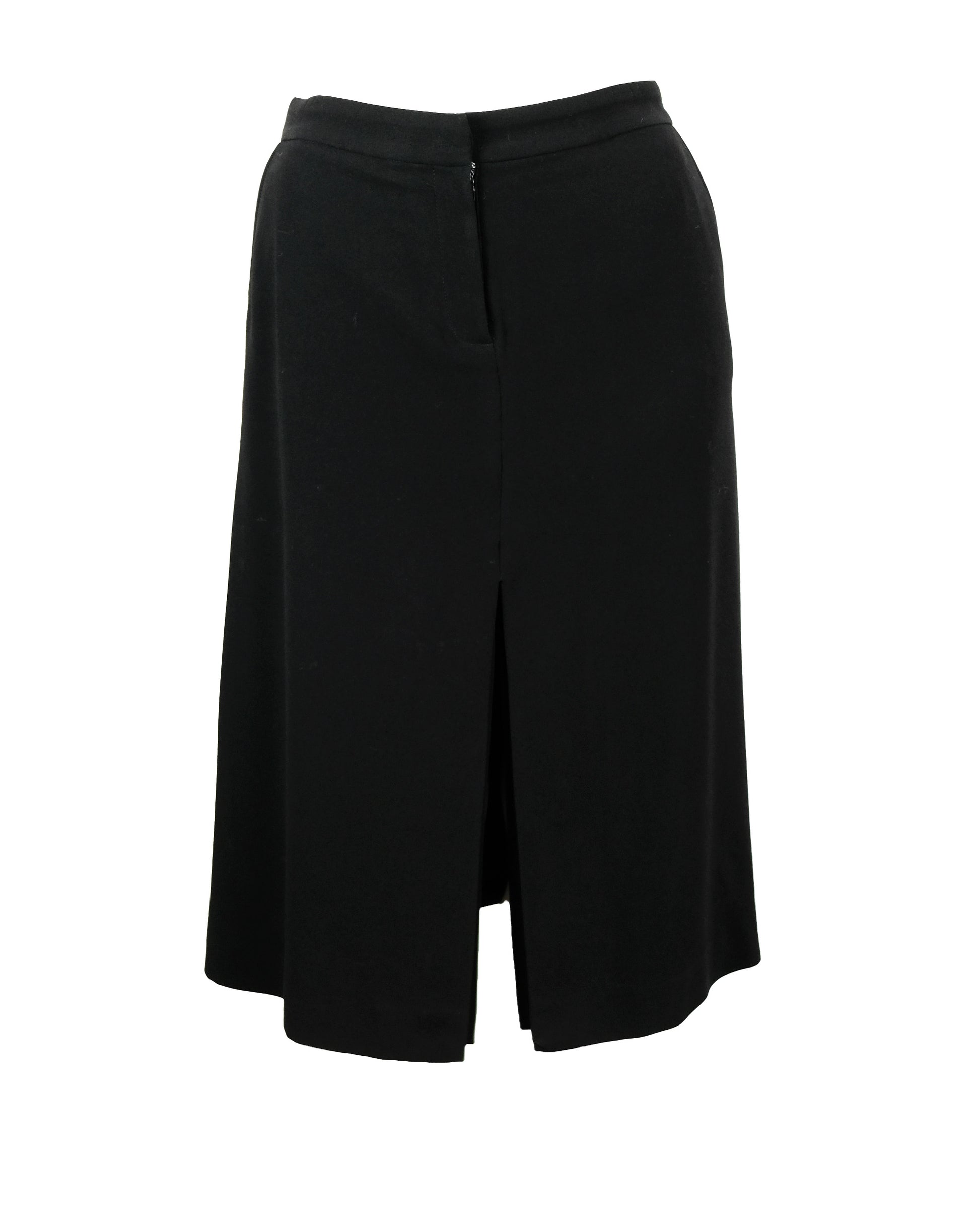 A flattering A-line skirt in black crepe by Joseph, featuring a high front split with double facing pleat. It ends below the knee and has a central zip fastening with side pockets and shallow back pockets. Fully lined.